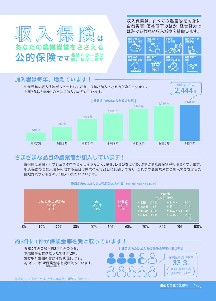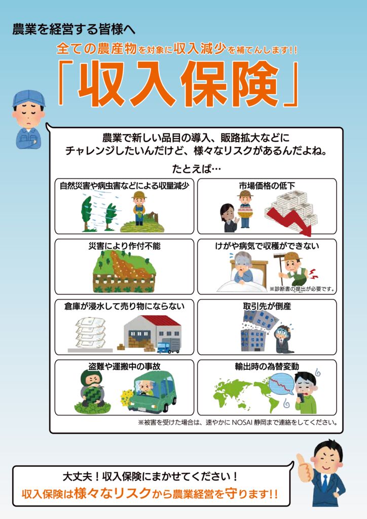 - 静岡市における収入保険の加入促進への取り組みについて 静岡市、JA静岡市、JAしみず、NOSAI静岡における、2020年度の収入保険の加入促進への取り組みに関するレポートです。